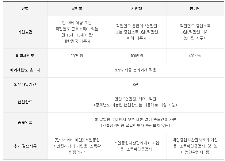 ISA계좌는 일반형, 서민형, 농어민 유형으로 나뉘어지고, 3년의 의무 가입기간을 가지며 연간 2천만원씩 최대 1억원까지 납입할 수 있습니다.
