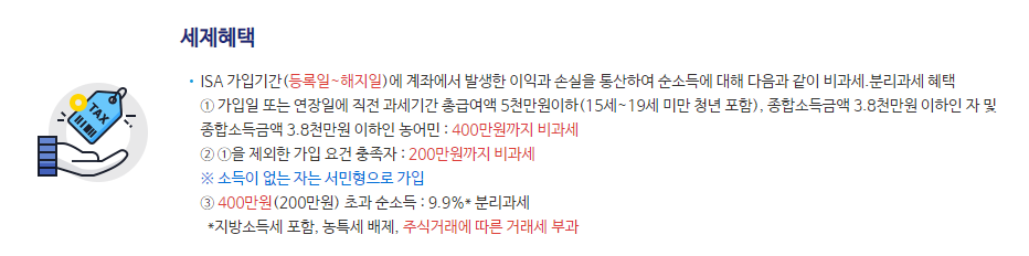 ISA계좌에서 발생한 수익 중 서민형, 농어민의 경우에는 최대 400만원까지 비과세 적용되고, 그 초과분은 9.9% 분리과세 적용을 받을 수 있습니다.