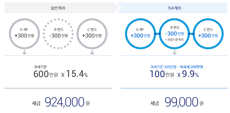 예를 들어, 펀드에서 300만 원의 손해를 보고 예금과 주식으로 600만 원의 이익을 봤다면, 일반 계좌에서는 600만 원 전체에 대해 15.4%의 세금이 부과돼요. 이렇게 되면 세금이 92만 4천 원이 돼요.