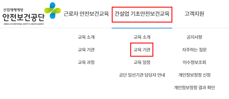 안전보건공단 교육포털을 온라인으로 접속하면 건설업 기초안전보건교육 탭에서 '교육기관'을 선택하여 교육이수 받을 장소를 찾을 수 있습니다.