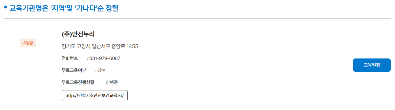지역 및 무료교육여부, 등급을 선택하여 본인이 원하는 장소의 건설업 기초안전보건교육 기관 및 교육일정을 간단히 확인할 수 있으니 직접 온라인으로 확인해보는 것이 좋습니다.