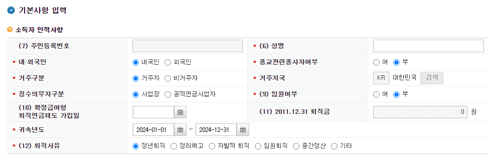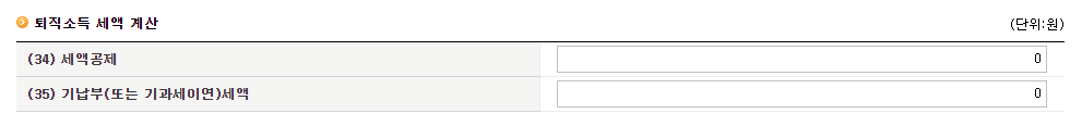 이동된 페이지에서 소득자 인적사항, 퇴직급여 현황, 근속연수, 퇴직소득 세액을 기입하고 "계산하기"를 누르면 간단하게 퇴직금 세금을 계산할 수 있습니다.