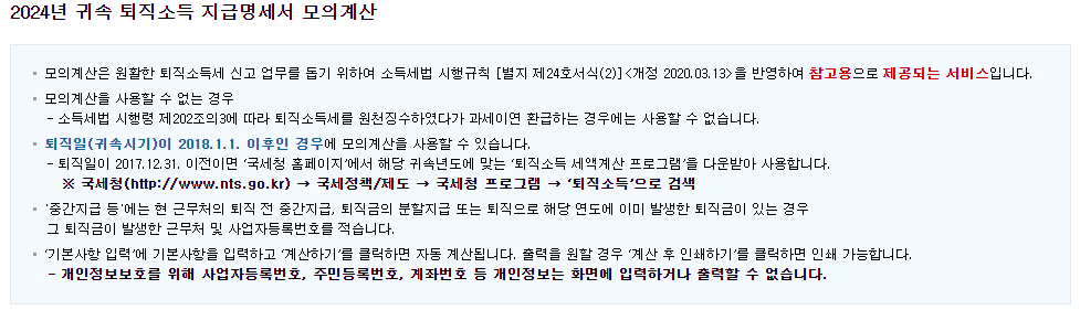 복잡한 여러가지 공식을 거쳐서 퇴직금의 세금을 계산하기보다는, 일부 항목을 입력하면 자동으로 계산해주는 퇴직소득 세액계산을 이용할 수 있습니다.