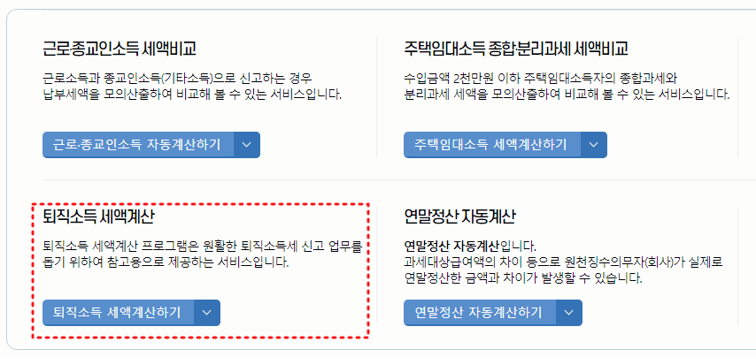홈택스 홈페이지의 메인의 세무일정별 자주 찾는 메뉴에서 모의계산을 클릭하고, 다음 페이지에서 퇴직소득 세액계산하기를 선택해주시면 간단하게 사용할 수 있습니다.