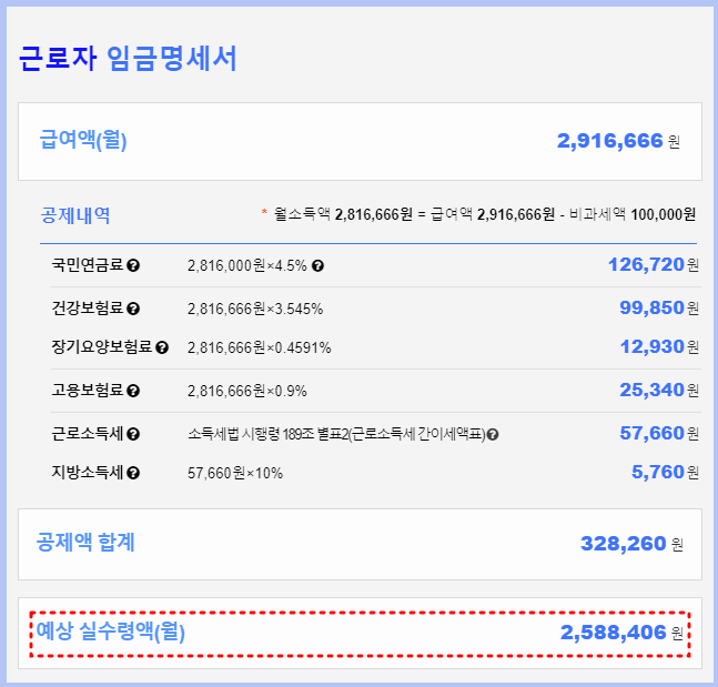 한 달 기준으로 공제되는 것들을 일목요연하게 정리하여 보여주는 장점을 가지고 있어서, 본인의 연봉을 적용하여 계산해보는 것도 좋을 것 같습니다.