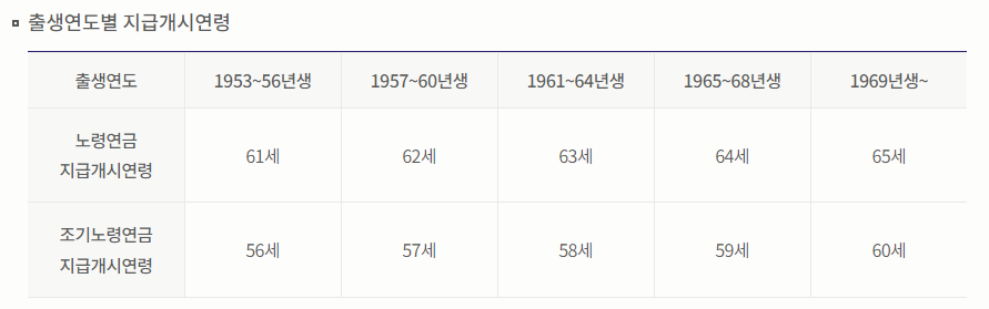 1953년부터 1968년 사이에 태어난 국민은 61세부터 64세 사이에 노령연금을 수령할 수 있으며, 1969년 이후 출생자는 65세부터 연금을 받을 수 있습니다.