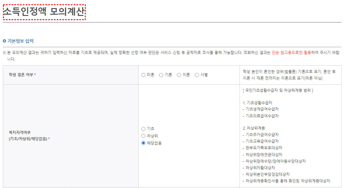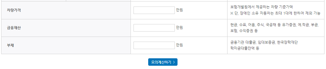 기본정보를 시작으로 학생 및 가구원 소득, 일반재산 합계액, 차량, 금융, 부채 등을 입력하면 본인이 속한 국가장학금 소득분위를 확인할 수 있습니다.