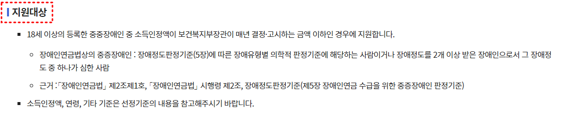 그 중 하나는 18세 이상이어야 한다는 거죠. 그리고 연금을 받을 수 있는 사람은 중증장애인 중에서도 소득이 일정 기준 이하인 경우에만 해당돼요.