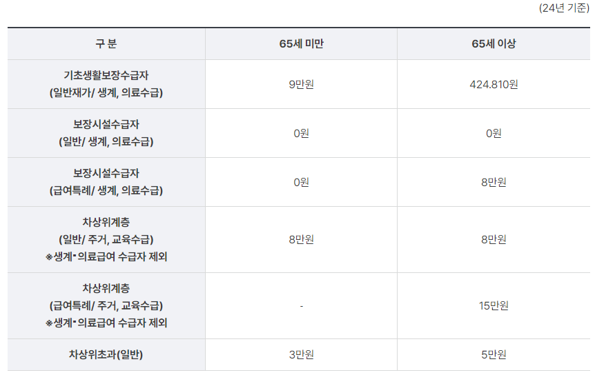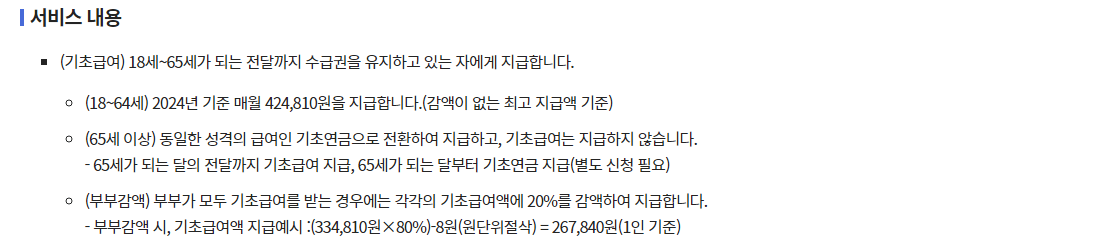 2024년 기준으로 소득과 재산을 합산한 소득인정액의 기준은 배우자가 없는 중증장애인은 130만원, 배우자가 있는 중증장애인은 208만원으로 확인할 수 있습니다.
