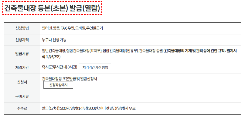 건축물대장 등본, 초본의 발급은 건당 500원, 열람은 건당 300원인데, 온라인으로는 무료열람 및 발급이 가능합니다.