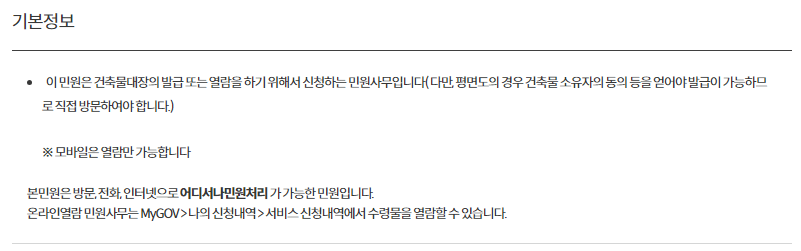 다양한 상황에서 건축물대장이 필요할 경우 민원24를 이용할 수 있고, 오프라인 발급 및 열람은 비용을 지불하지만 온라인으로 무료열람(발급)할 수 있습니다.