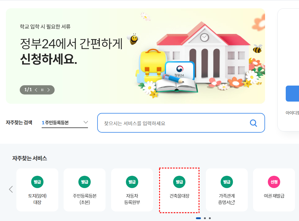 정부24(구 민원24)에 접속하면 메인에 '자주찾는 서비스' 목록을 보면, 건축물대장 메뉴를 찾아볼 수 있고 선택하시면 관련 페이지로 이동할 수 있습니다.