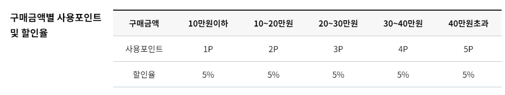 쇼핑몰에서의 구매별 사용포인트는 상품 가격에 따라 다르게 적용되는데요. 예를 들어 10만 원 이하의 상품을 구매할 때는 1포인트를, 40만 원 이상의 상품을 구매할 때는 5포인트를 사용할 수 있어요.
