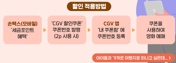 손택스 앱에서 '세금포인트 혜택'을 선택하고 CGV 할인 쿠폰 번호를 발행받은 후, CGV 앱의 '내 쿠폰함'에 해당 쿠폰 번호를 등록하면 준비 완료랍니다.
