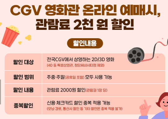 CGV 영화 할인 혜택은 신용카드나 체크카드 할인과 중복 적용이 가능하다는 점이 매력적이에요. 예를 들어 모닝 할인, 경로 할인 같은 추가 할인을 받는다면 한층 저렴한 가격으로 영화를 즐길 수 있어요.