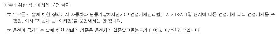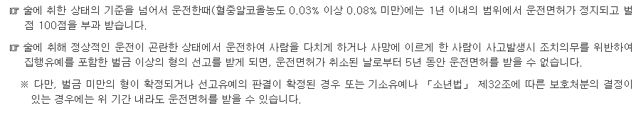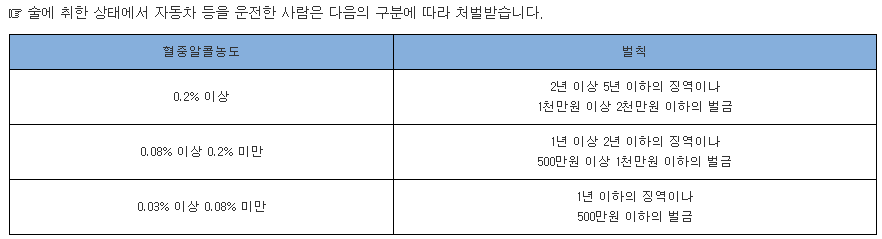 음주운전의 처벌 기준은 혈중알코올농도에 따라 나뉘어 있습니다.