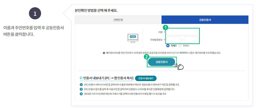 개인정보 입력 단계에서는 이름, 주민등록번호, 연락처 등을 입력하고 본인인증 절차를 거쳐야 해요.