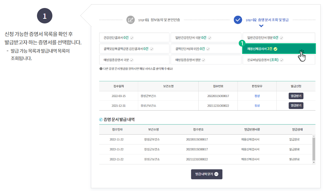 이렇게 본인 인증을 마치고 발급 신청 버튼을 누르면, 보건증 발급이 완료돼요.