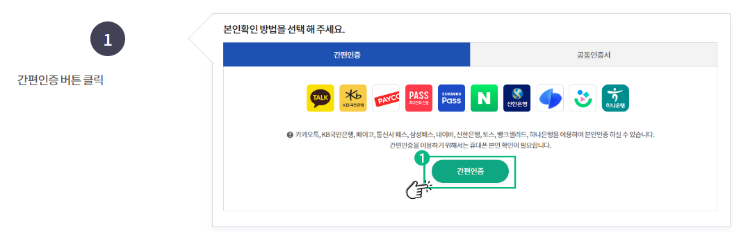 간편 인증(카카오톡, 네이버) 또는 공동 인증서를 이용해 본인 인증을 진행할 수 있어요. 편리한 방법을 선택해 사용하면 돼요.