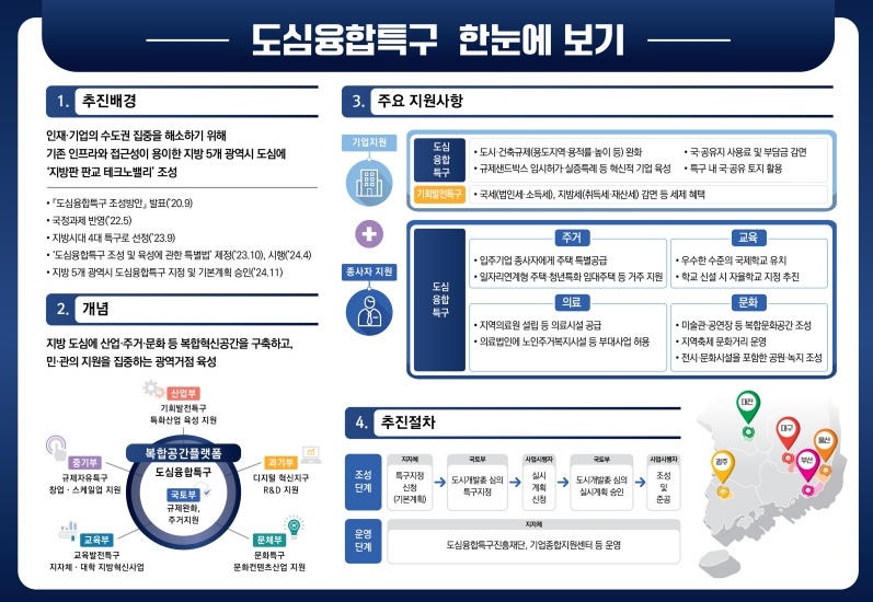 A. 도심융합특구는 산업, 주거, 문화 등이 복합된 혁신공간으로, 기업과 청년을 위한 지원이 집중되는 광역 성장거점입니다.