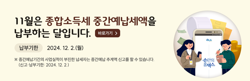 2024년 종합소득세 중간예납의 납부기한은 매년 마찬가지로 11월 30일입니다. 이 기한 내에 미납하게 되면 가산세가 부과될 수 있기 때문에 기한을 놓치지 않도록 주의해야 해요.