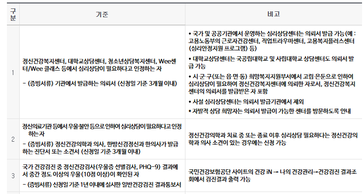 자격 조건을 충족한다면 심리적 안정을 위한 서비스를 받을 수 있는 기회가 열리게 됩니다.
