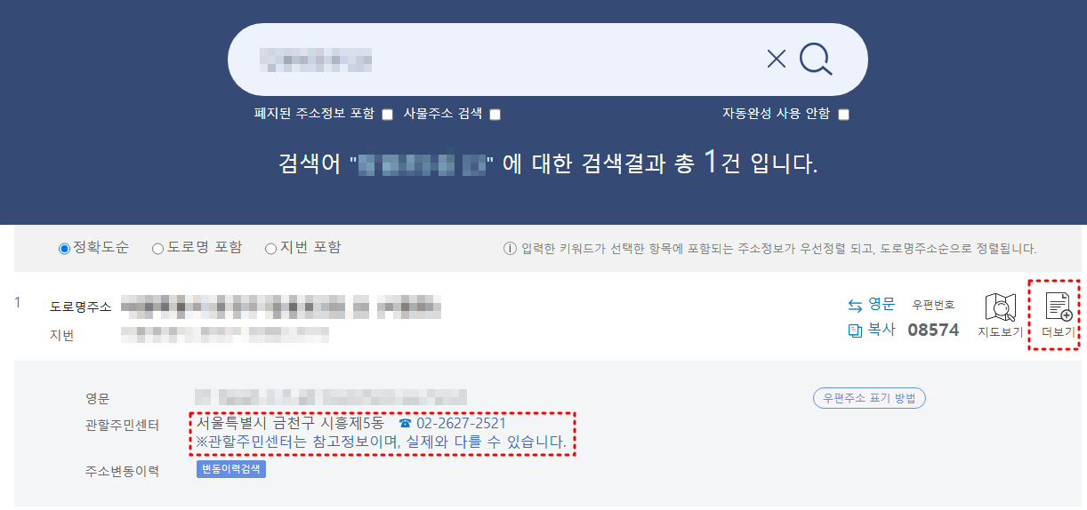 도로명주소 사이트에서 거주지 주소를 검색하고, 검색 결과에서 '더보기'를 선택하면 관할 주민센터를 바로 확인할 수 있어요.