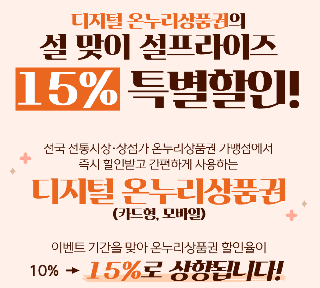 온누리 상품권은 전통시장 활성화와 더불어 소비자들에게 다양한 혜택을 제공하고 있습니다. 최근에는 설 명절을 맞아 특별히 15% 할인된 가격으로 제공되고 있어 많은 분들이 관심을 가지고 있죠.