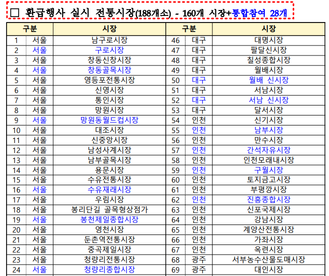 특히, 기존에 참여했던 160개 시장에 추가로 28개의 전통시장이 포함되었는데요. 이는 전통시장 간의 협력을 강화하고 더 많은 지역 소비자가 혜택을 누릴 수 있도록 하기 위한 조치입니다.