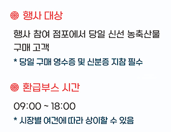 환급을 위한 절차는 간단합니다. 먼저, 전통시장에서 국산 농축산물을 구매한 후 영수증과 신분증을 챙겨 환급 부스로 이동하세요. 부스에서는 신분증이나 개인 신용카드 등으로 본인 확인을 진행합니다.
