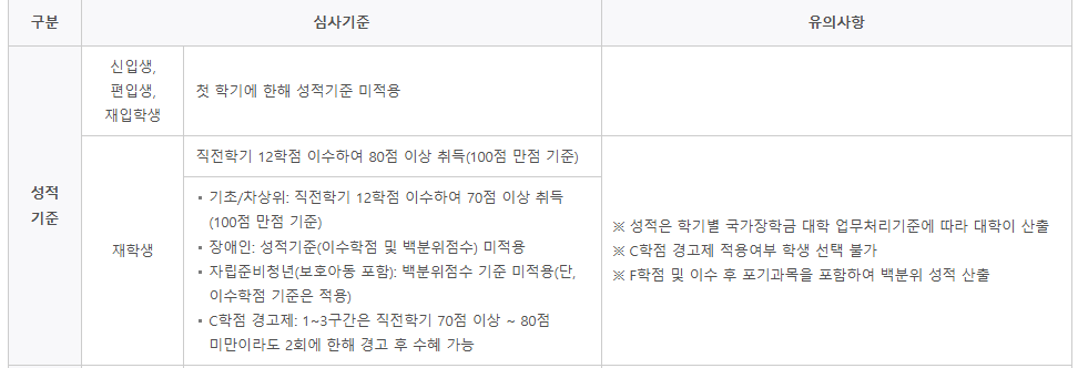 하지만 기초생활수급자 및 차상위계층 학생들의 경우 성적 기준이 완화돼요. 이들은 70점(2.0점) 이상이면 지원받을 수 있어요.