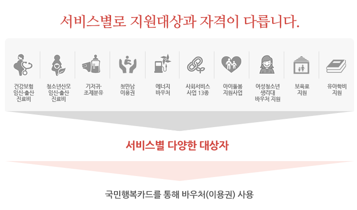 ① 발급 대상: 국민행복카드는 임산부, 저소득층, 장애인, 영유아 보호자 등 정부의 복지 바우처를 받을 수 있는 계층을 대상으로 제공돼요.