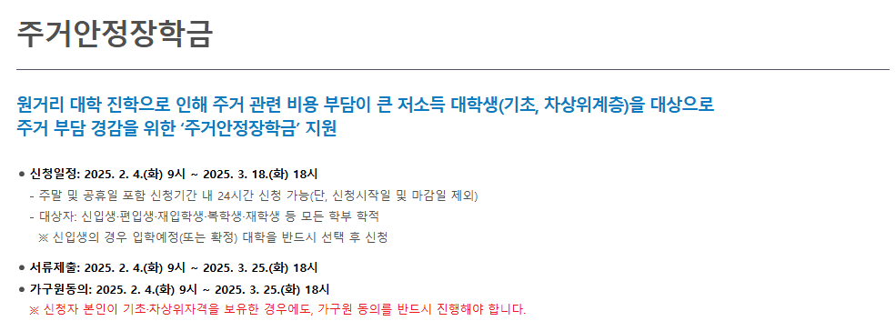 주거안정장학금은 한정된 예산 내에서 운영되기 때문에, 신청 마감일을 놓치지 않는 것이 중요해요. 2025년 신청 기간은 2월 4일부터 3월 18일까지이며, 마감 이후에는 추가 접수가 불가능해요.
