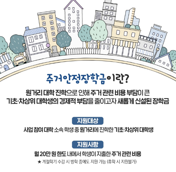 주거안정장학금은 국가장학금과는 별도로 운영되기 때문에 국가장학금을 받고 있더라도 추가로 지원받을 수 있어요.
