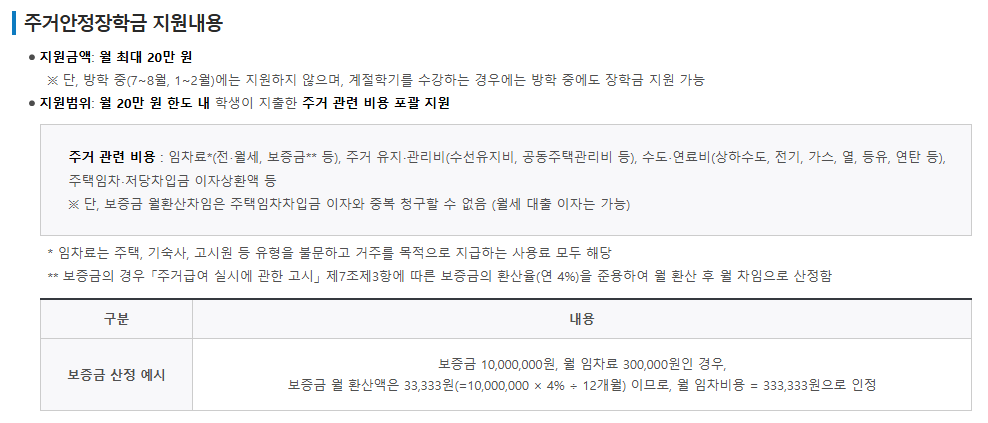 다만, 주거 관련 비용을 지원하는 다른 장학금(예: 대학 자체 주거 지원 장학금)과는 중복 수혜가 제한될 수 있어요.