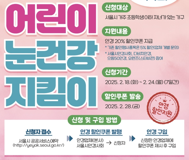 서울시에서 진행하는 ‘어린이 눈건강 지킴이 사업’이 새 학기를 맞아 다시 시작됩니다. 지난해에도 많은 가정에서 큰 관심을 보였던 이 사업은 어린이들의 눈 건강을 지키고, 안경 구입 시 할인 혜택을 받을 수 있도록 지원하는 프로그램이에요.