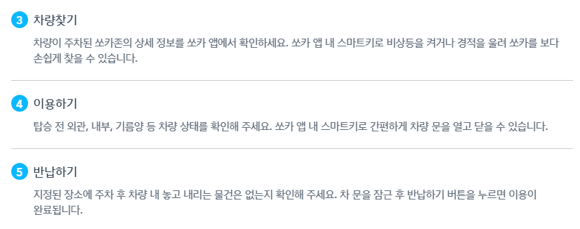 쏘카를 처음 이용하는 분들도 쉽게 사용법을 알 수 있도록 시스템이 잘 갖춰져 있어요. 처음이라서 어렵게 느껴진다면 한 번 직접 해보는 것이 어떨까요?