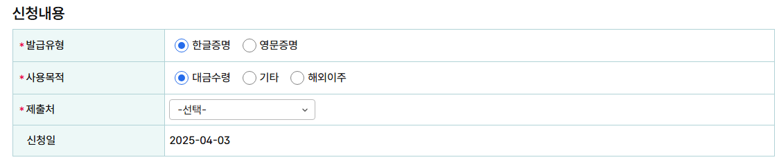 예를 들어, 금융기관 제출용, 관공서 제출용 등으로 선택할 수 있고요, 제출처를 직접 입력할 수도 있어요. 개인이 참고용으로 발급받을 땐 ‘기타’로 선택해도 무방해요.