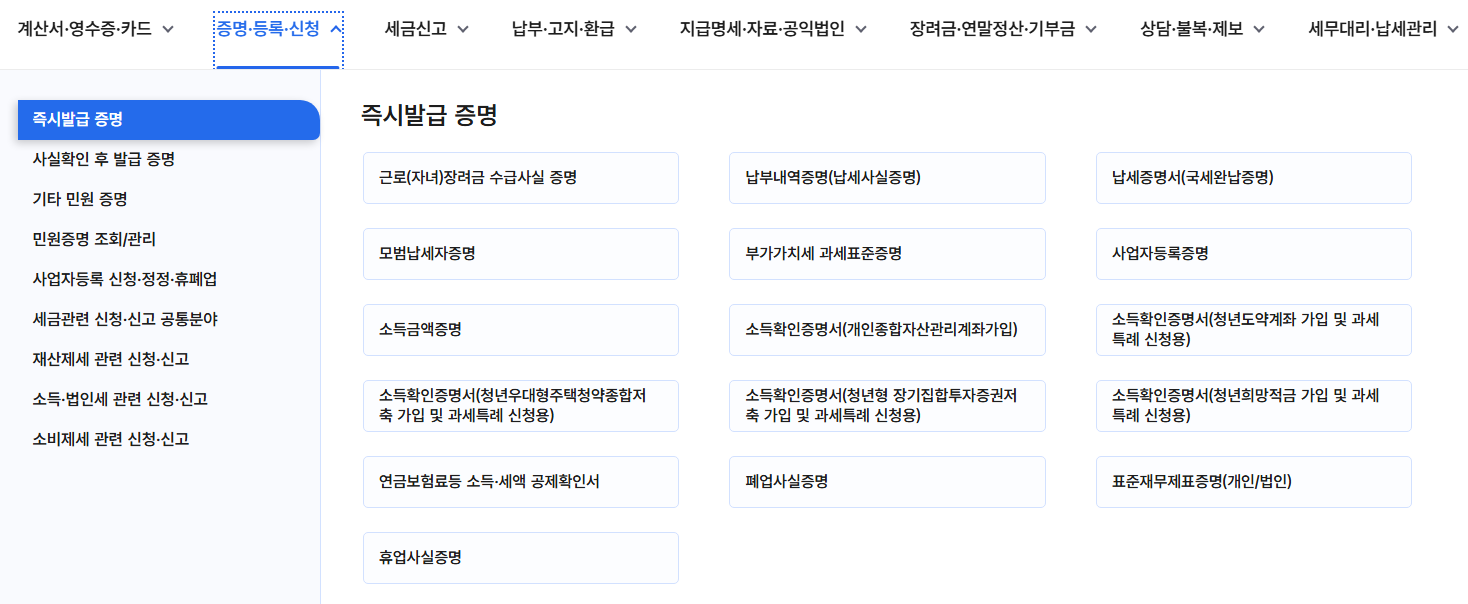 로그인 후에는 ‘민원증명’ 메뉴에서 '국세 완납증명서(납세증명서)'를 선택하면 돼요. 실제 명칭은 ‘납세증명서’로 되어 있으니 혼동하지 않도록 주의해야 해요.
