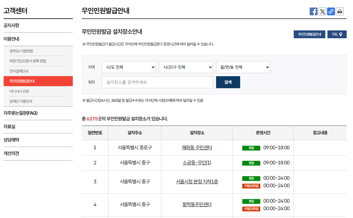 특히 정부24에서는 ‘무인민원발급 안내’ 메뉴를 통해 시·군·구별 발급기 위치, 운영 시간, 제공 서비스 항목을 조회할 수 있도록 잘 정리돼 있어요.