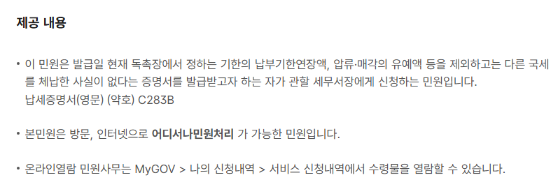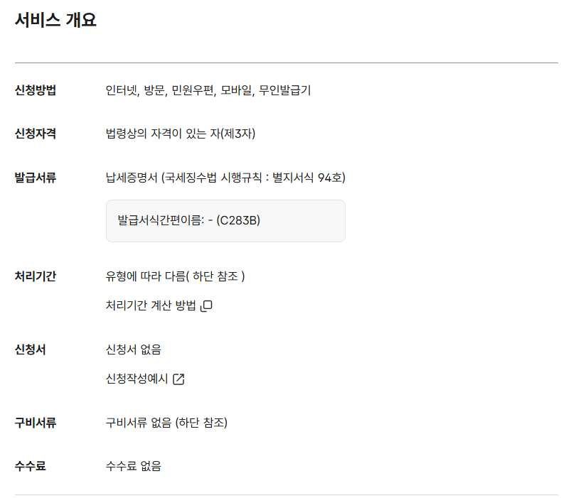 이 증명서는 이름 그대로 납세자의 모든 국세가 완납된 상태에서만 발급이 가능하기 때문에, 미납 세금이 하나라도 존재하면 발급 자체가 되지 않아요.