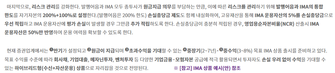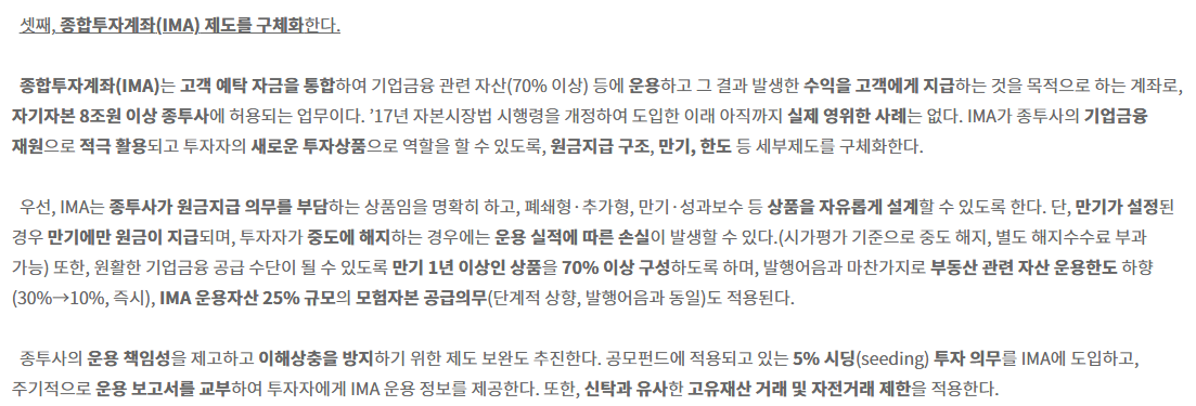 IMA는 투자자의 자금을 증권사가 책임지고 운용하면서 이 자금을 미래 잠재력이 높은 기업에 공급하는 통로가 되는 셈입니다.