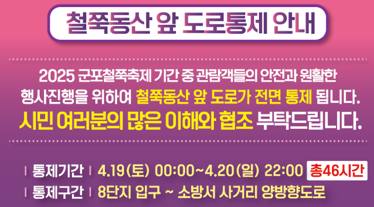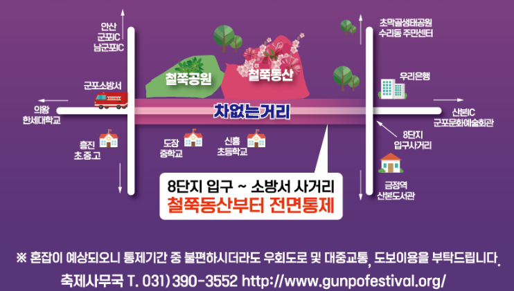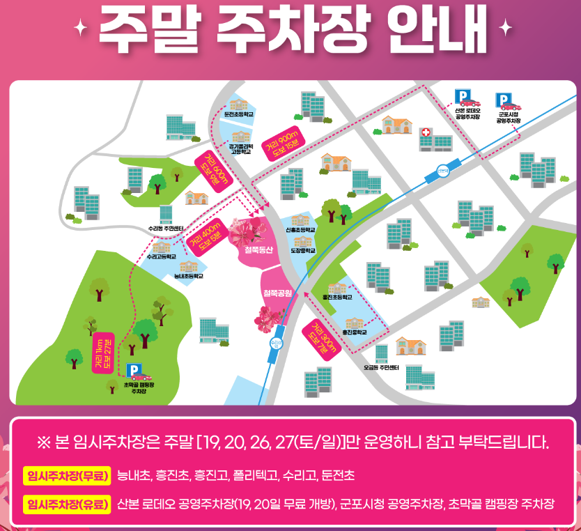 또한 축제 기간 동안 일부 도로가 통제될 수 있으니, 네비게이션에 ‘군포 철쭉동산’만 입력하지 마시고 교통 통제 공지를 확인하고 출발하는 것이 좋아요.