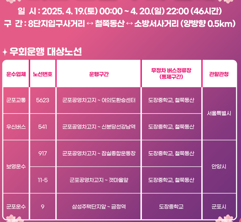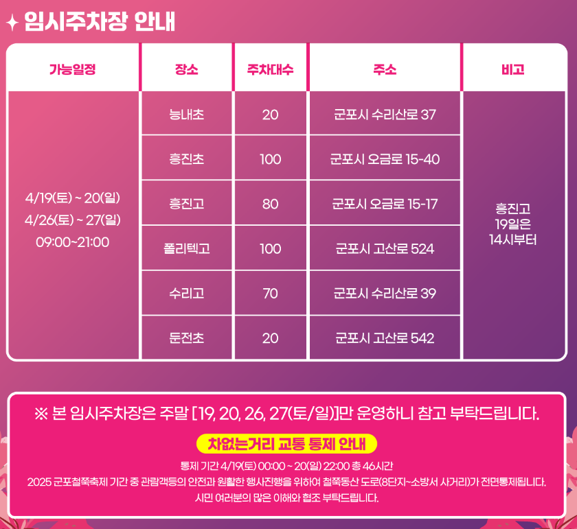또한 축제 기간 동안에는 산본역과 행사장 간 무료 셔틀버스가 운행될 예정이에요. 이 셔틀은 주말과 공휴일에 집중적으로 운영되며, 15~20분 간격으로 순환한다고 해요.