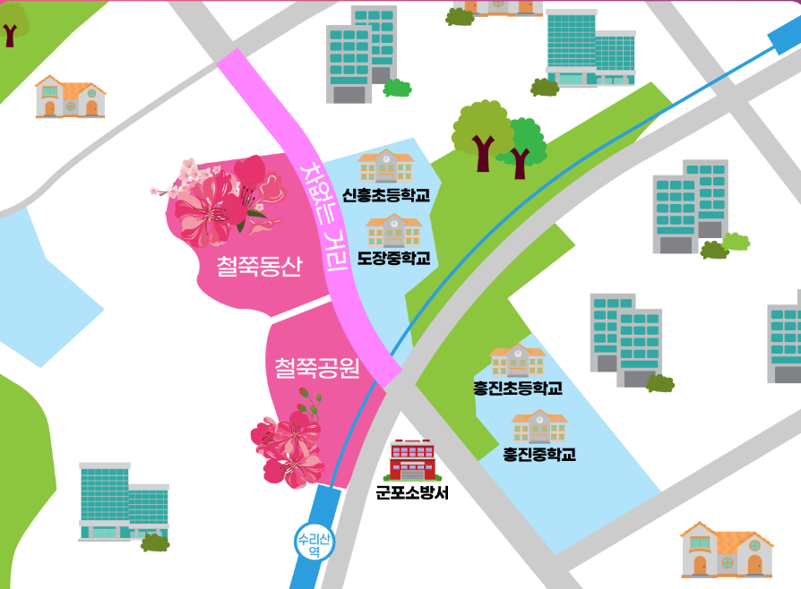 군포 철쭉축제는 대중교통으로도 편하게 접근할 수 있어요. 가장 가까운 지하철역은 4호선 ‘산본역’과 ‘수리산역’으로, 두 역 모두 철쭉동산과 도보 10분 이내 거리에 위치해 있어요.