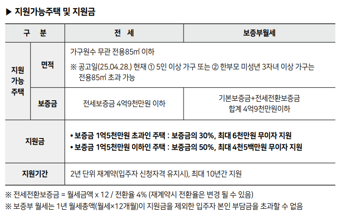 지원 대상 주택은 전용면적 85㎡ 이하의 공동주택, 다가구, 연립주택 등이에요. 다만 주택의 보증금이 일정 기준 이하(수도권 2억 5천만 원 이하, 비수도권 2억 원 이하)일 때만 해당해요.