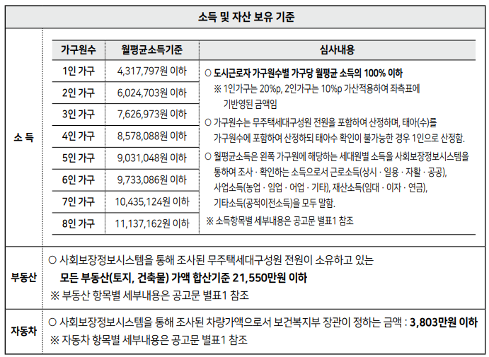 2025년 기준으로 3인 가구의 경우 약 460만 원 이하의 소득이면 지원 가능하며, 부동산 자산은 2억 9천만 원 이하, 자동차 가액은 3,600만 원 이하로 제한돼요.