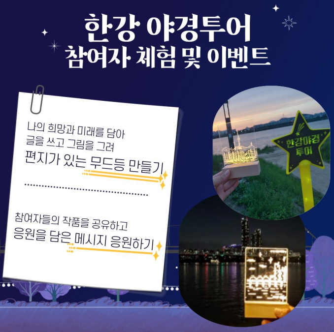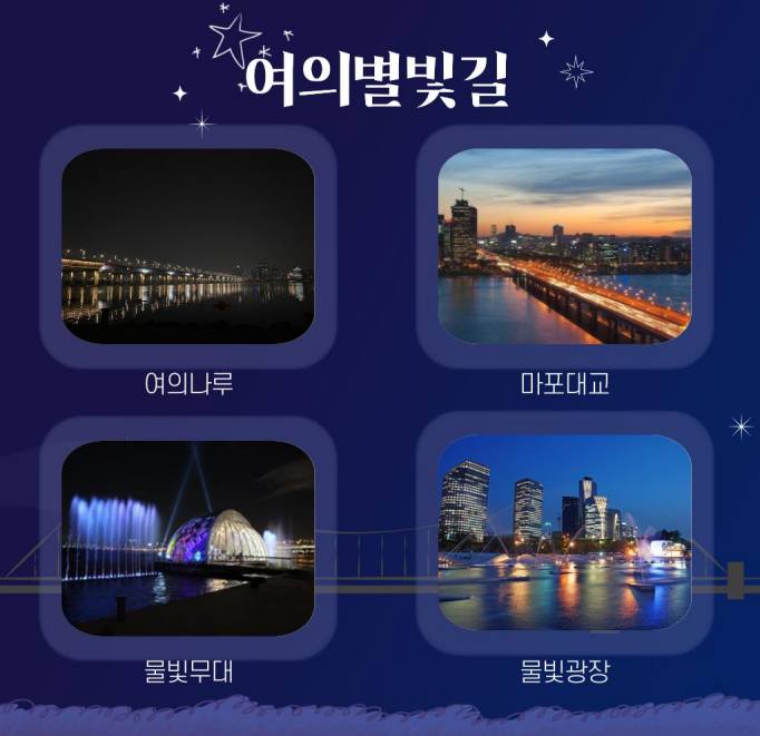 여의도 한강 야경투어는 ‘여의별빛길’이라는 이름으로 진행되며, 한강예술공원을 시작으로 여의나루, 마포대교, 물빛무대, 물빛광장을 잇는 코스로 구성되어 있어요.