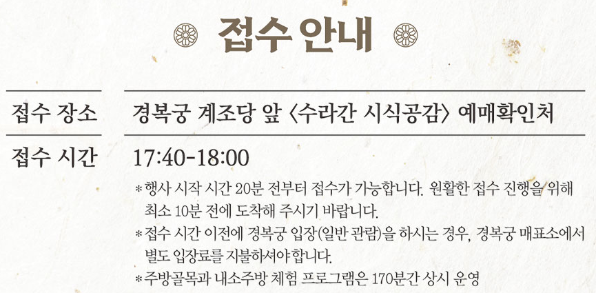 대부분 행사장은 경복궁 내 수정전 일대에서 진행되며, 입장 시간보다 최소 20분 전 도착을 권장하고 있어요.