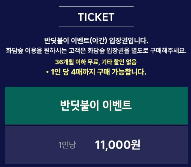반딧불이는 해가 진 뒤에만 볼 수 있기 때문에 야간권이 인기가 많은데요, 입장료는 성인 기준 약 10,000원 정도이며, 어린이나 노인은 할인 혜택이 적용됩니다. 유아는 무료 입장도 가능해요.